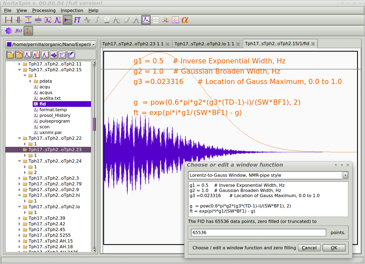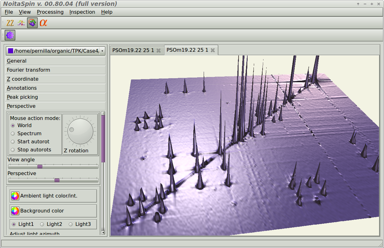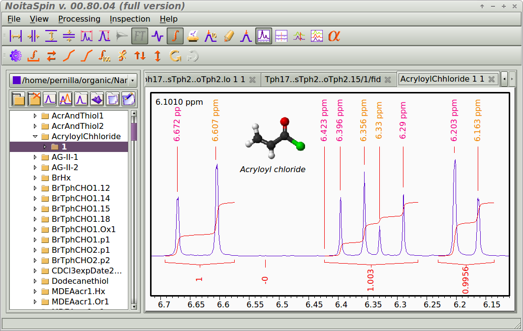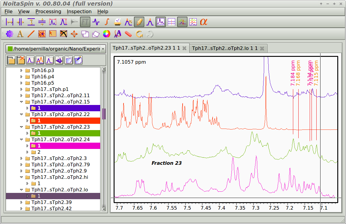 Several 1D spectra superimposed, several spectrum tabs, annotation mode: